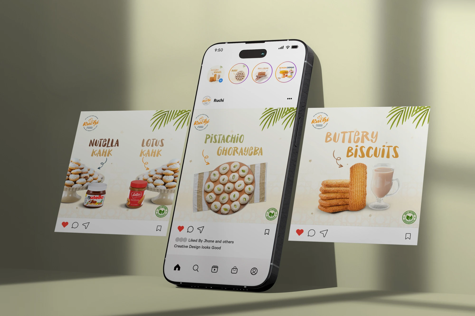 This campaign was designed to spotlight Ruchi’s signature festive and seasonal offerings, using clean, appetizing visuals and product-focused storytelling. Each design centered around rich textures and classic treats; from buttery biscuits to chocolate chip cookies and stuffed kahk; styled to evoke warmth, tradition, and indulgence. The light, inviting aesthetic paired with playful typography gave the brand a cheerful yet premium tone, while product variety was emphasized to appeal to a broad audience. This content not only drove appetite appeal but also reinforced Ruchi’s identity as a go-to destination for handcrafted, high-quality sweets.
