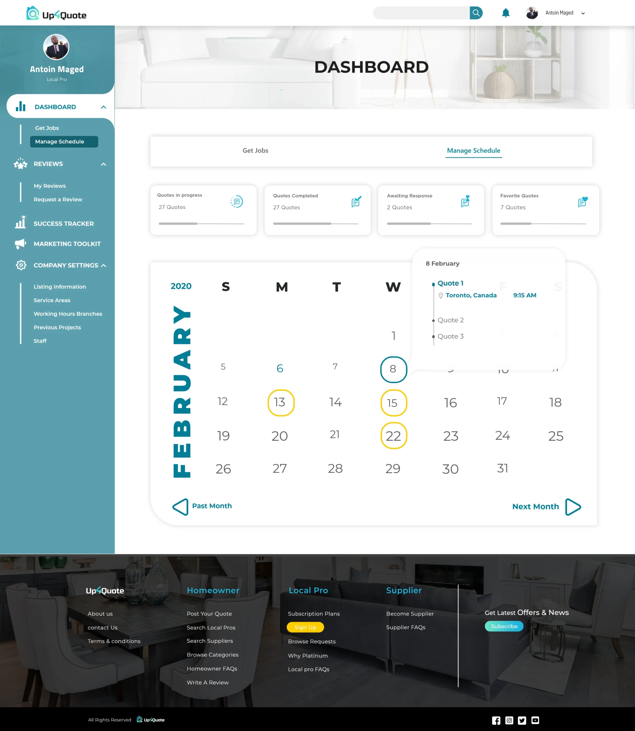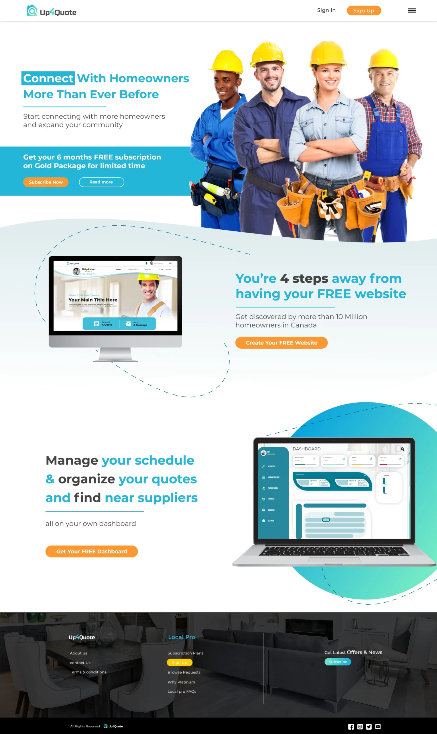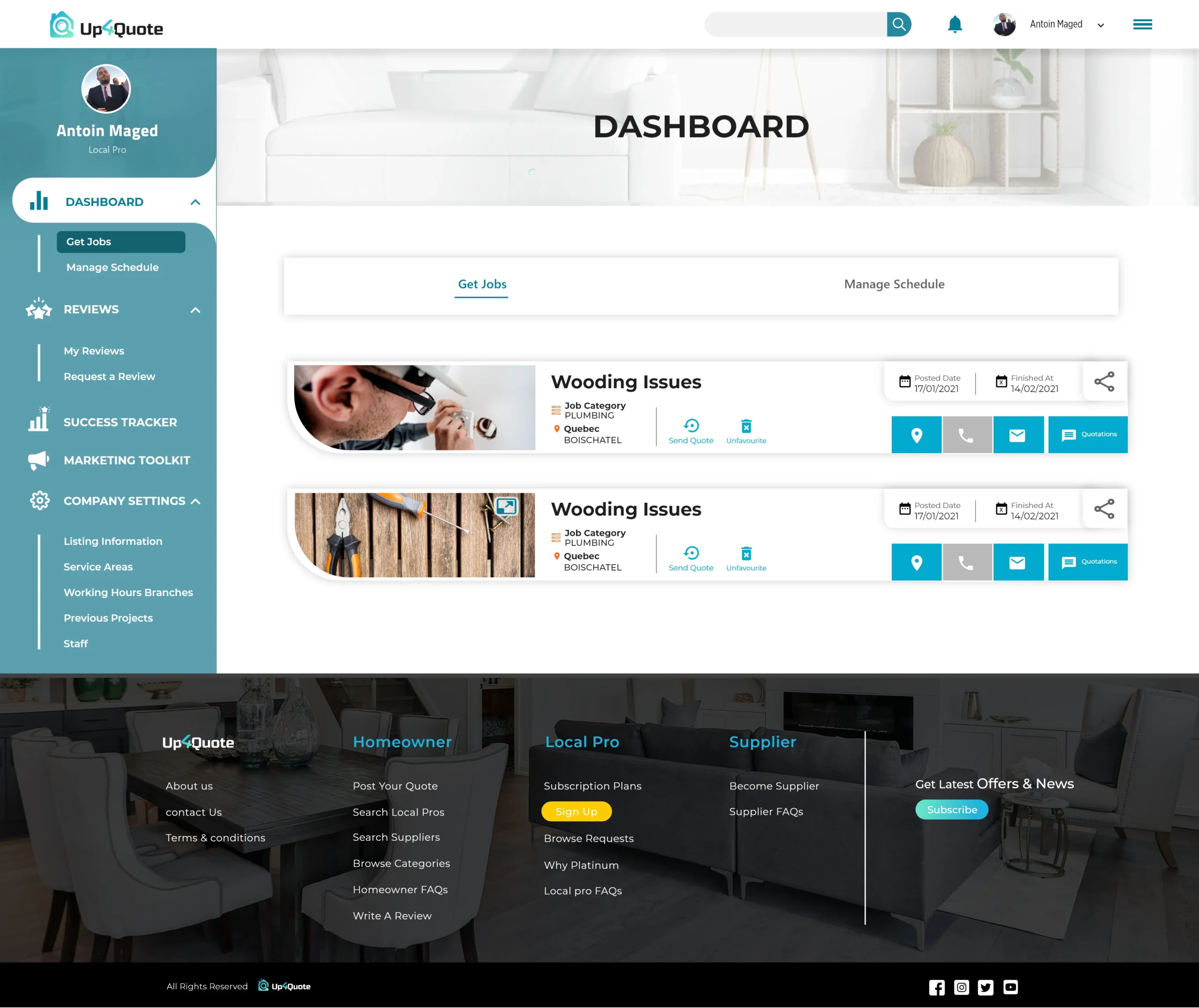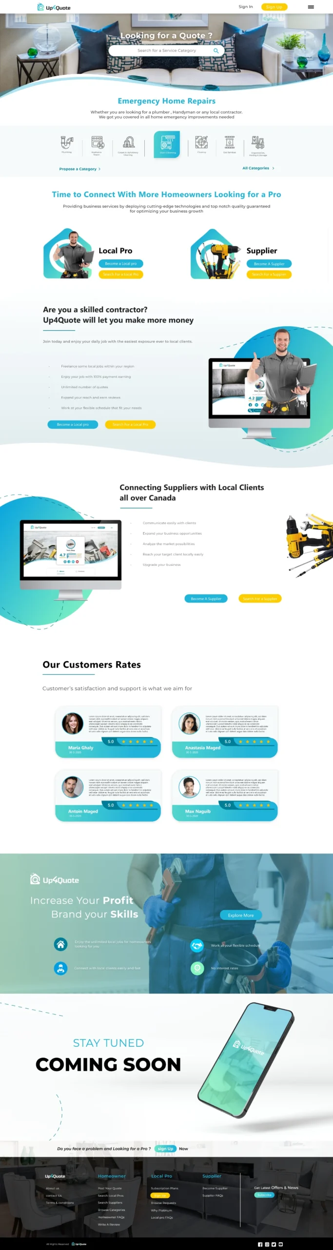 The Up 4 Quote website was developed as a clean, intuitive service marketplace where users can easily report household problems and receive quick support from nearby professionals. Homeowners are guided through a step-by-step form to submit their service needs, while local pros receive requests in real time and can schedule appointments directly through the platform. The user journey was carefully designed to reduce friction, build trust, and enable fast resolutions, making the platform a practical go-to for home services across Canada.