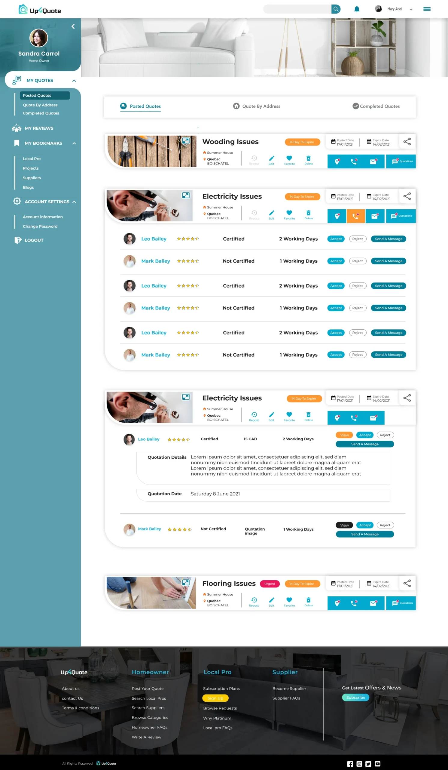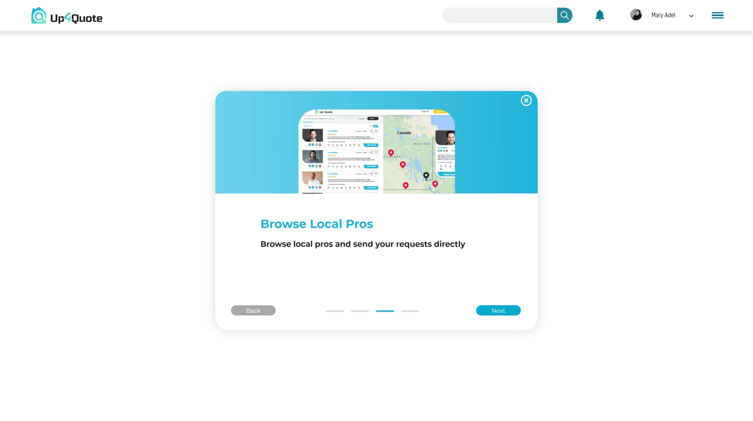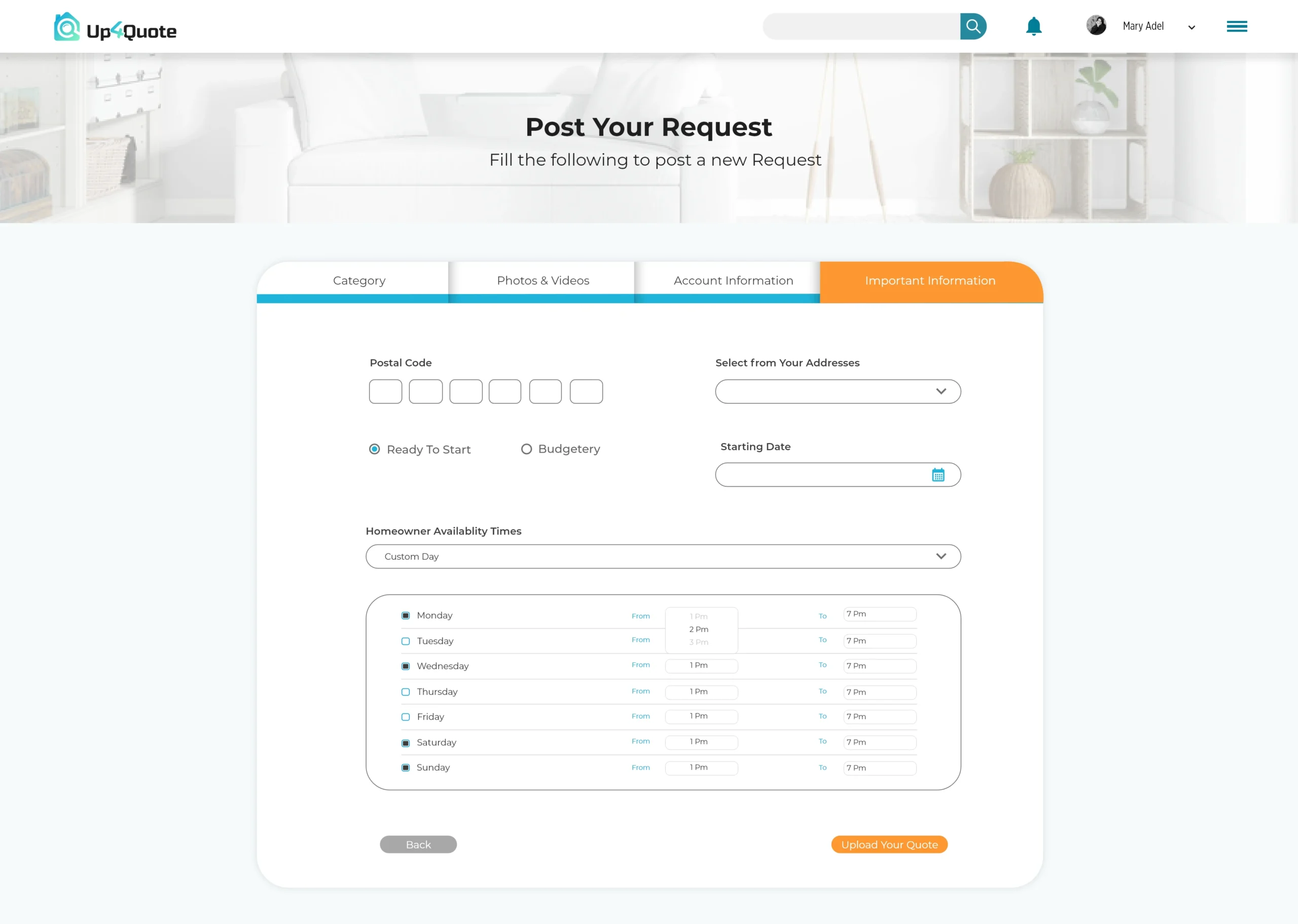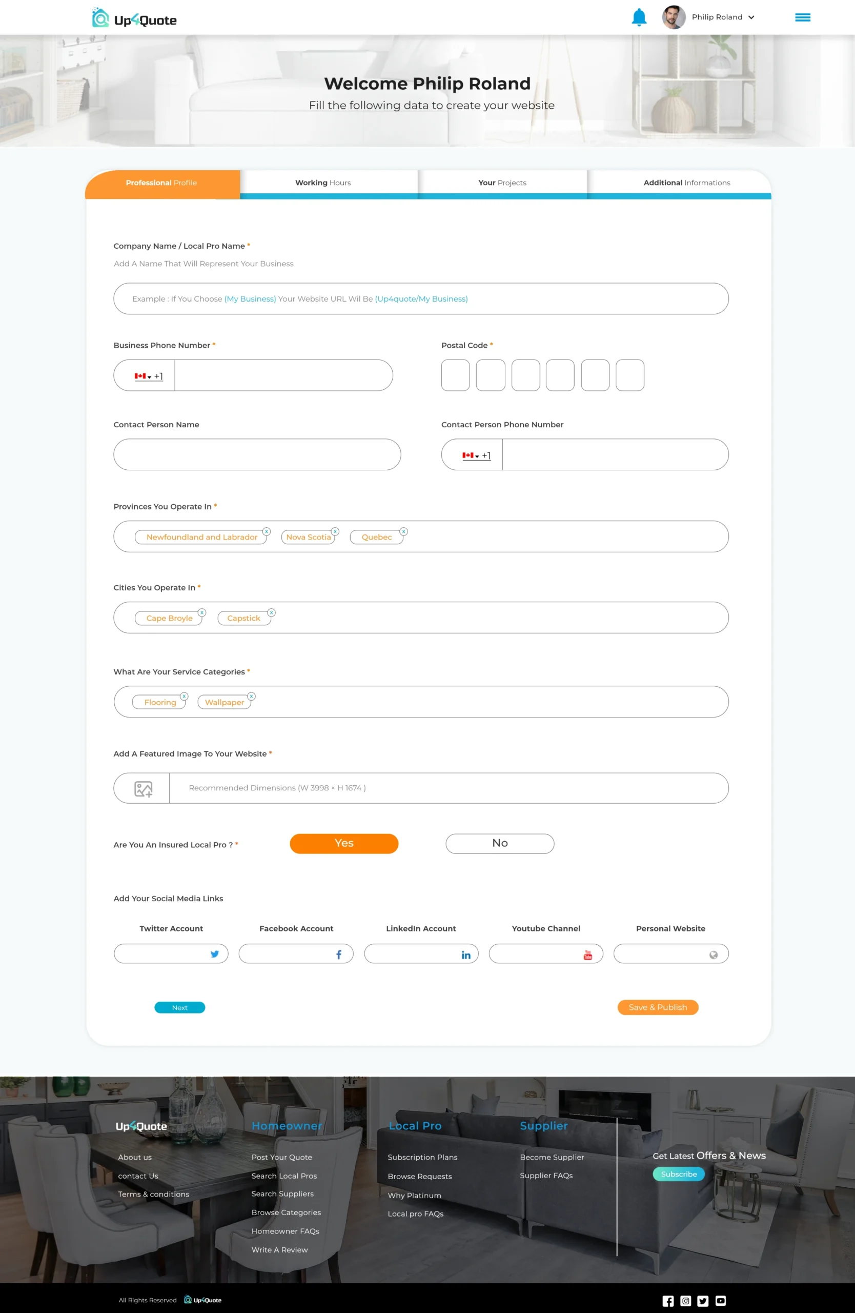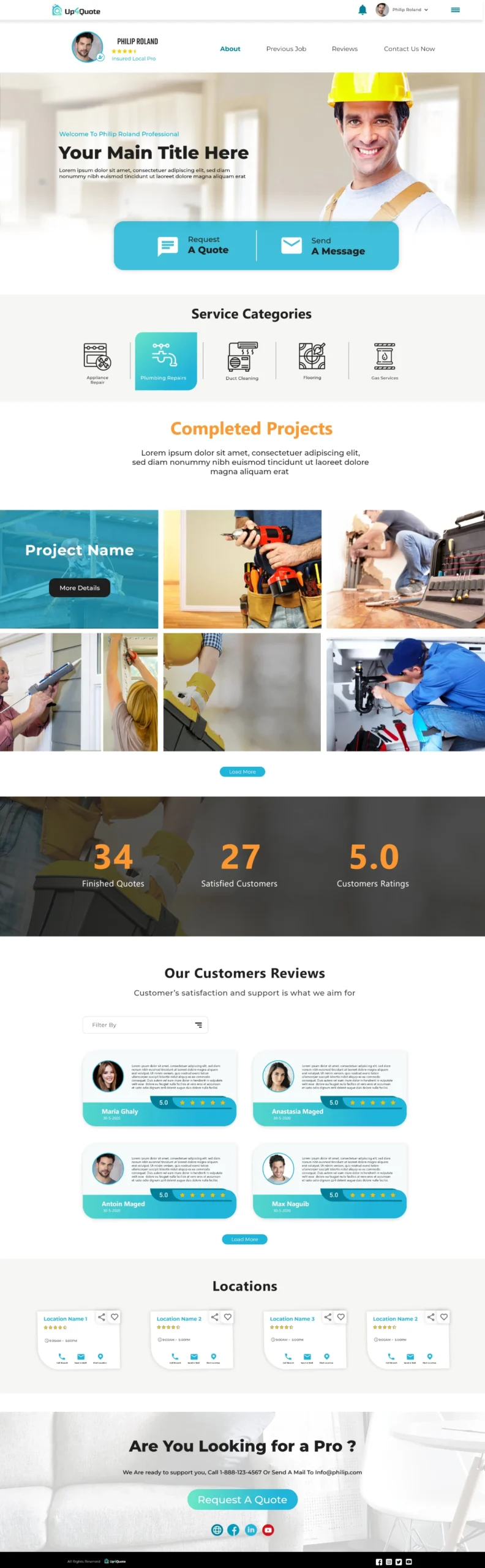 The Up 4 Quote website was developed as a clean, intuitive service marketplace where users can easily report household problems and receive quick support from nearby professionals. Homeowners are guided through a step-by-step form to submit their service needs, while local pros receive requests in real time and can schedule appointments directly through the platform. The user journey was carefully designed to reduce friction, build trust, and enable fast resolutions, making the platform a practical go-to for home services across Canada.
