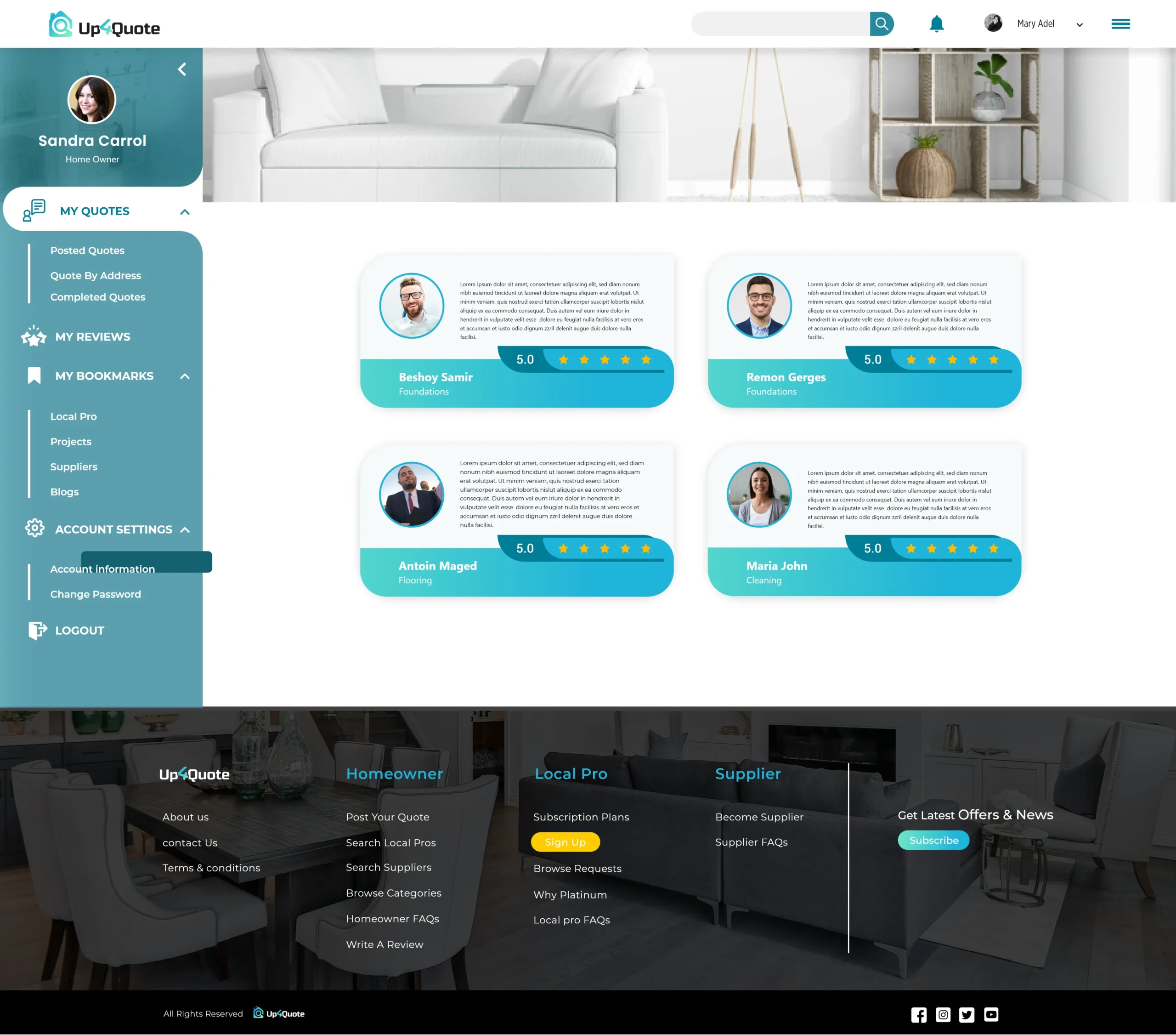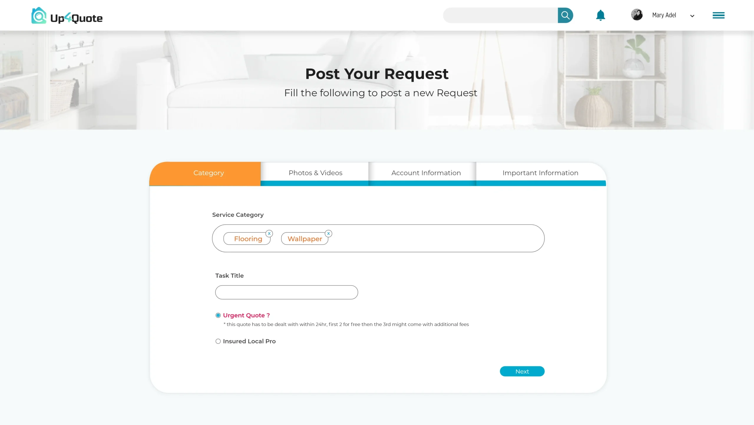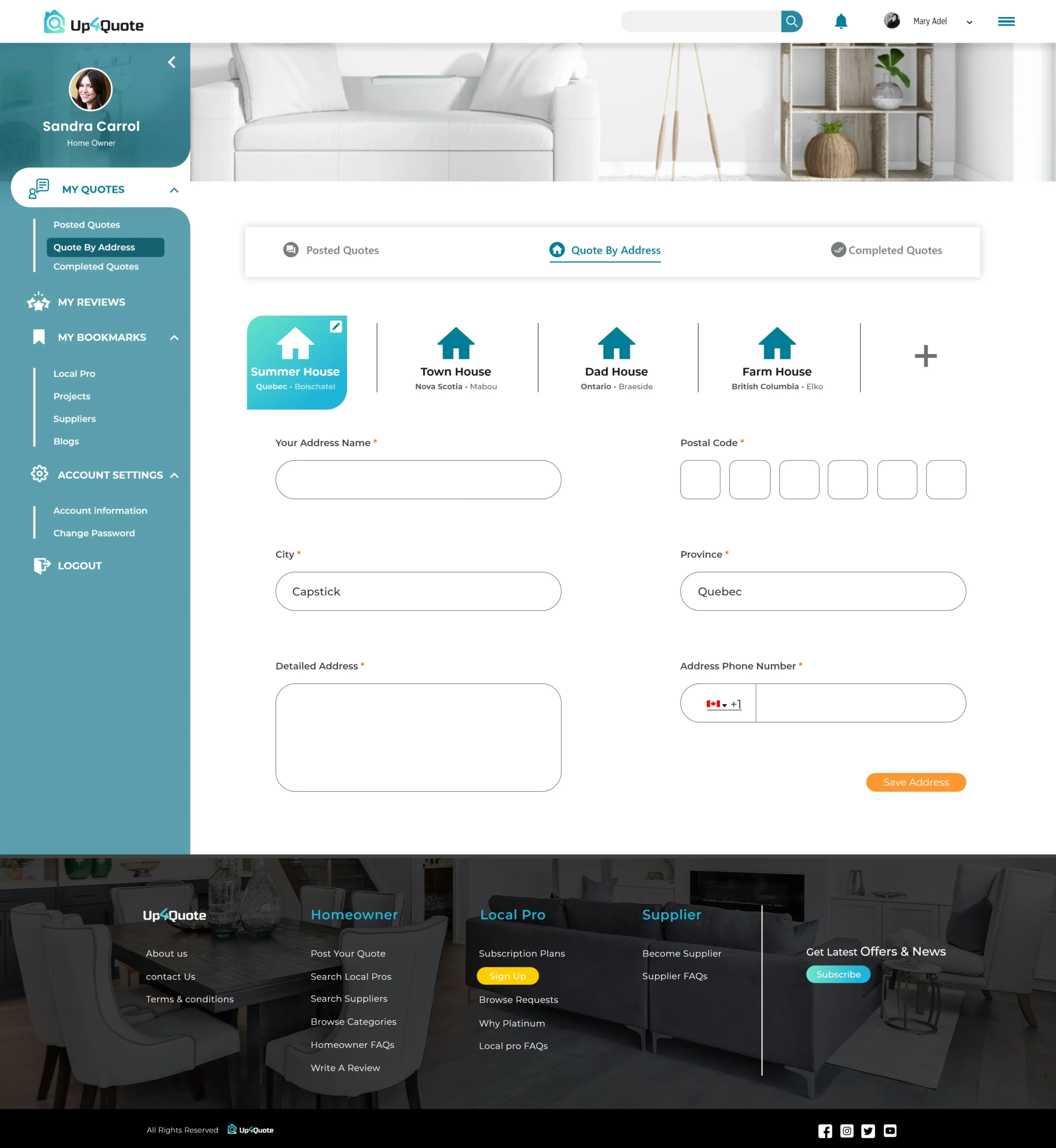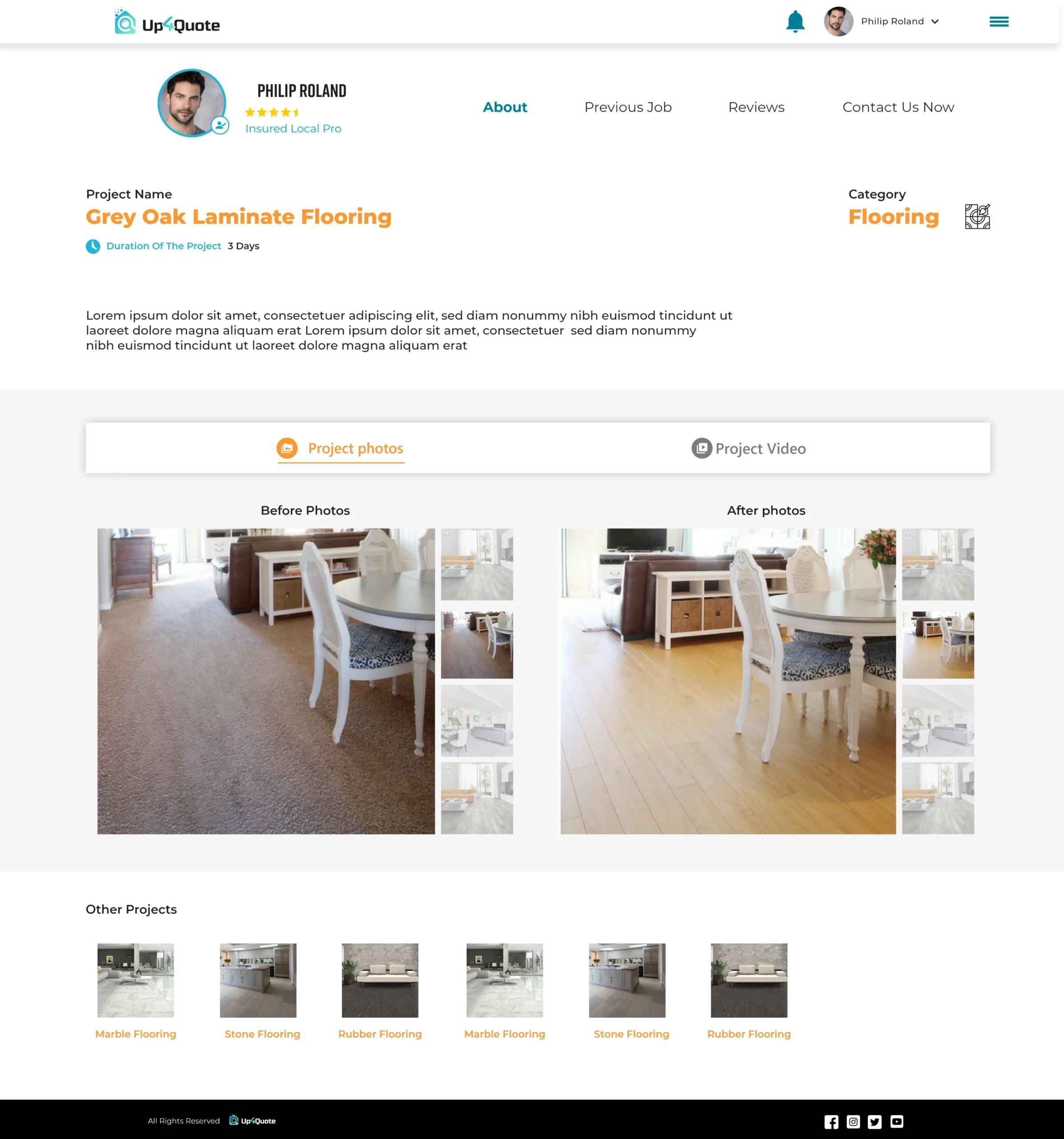 The Up 4 Quote website was developed as a clean, intuitive service marketplace where users can easily report household problems and receive quick support from nearby professionals. Homeowners are guided through a step-by-step form to submit their service needs, while local pros receive requests in real time and can schedule appointments directly through the platform. The user journey was carefully designed to reduce friction, build trust, and enable fast resolutions, making the platform a practical go-to for home services across Canada.